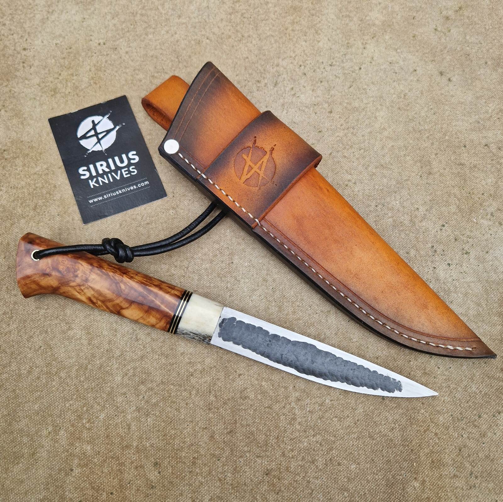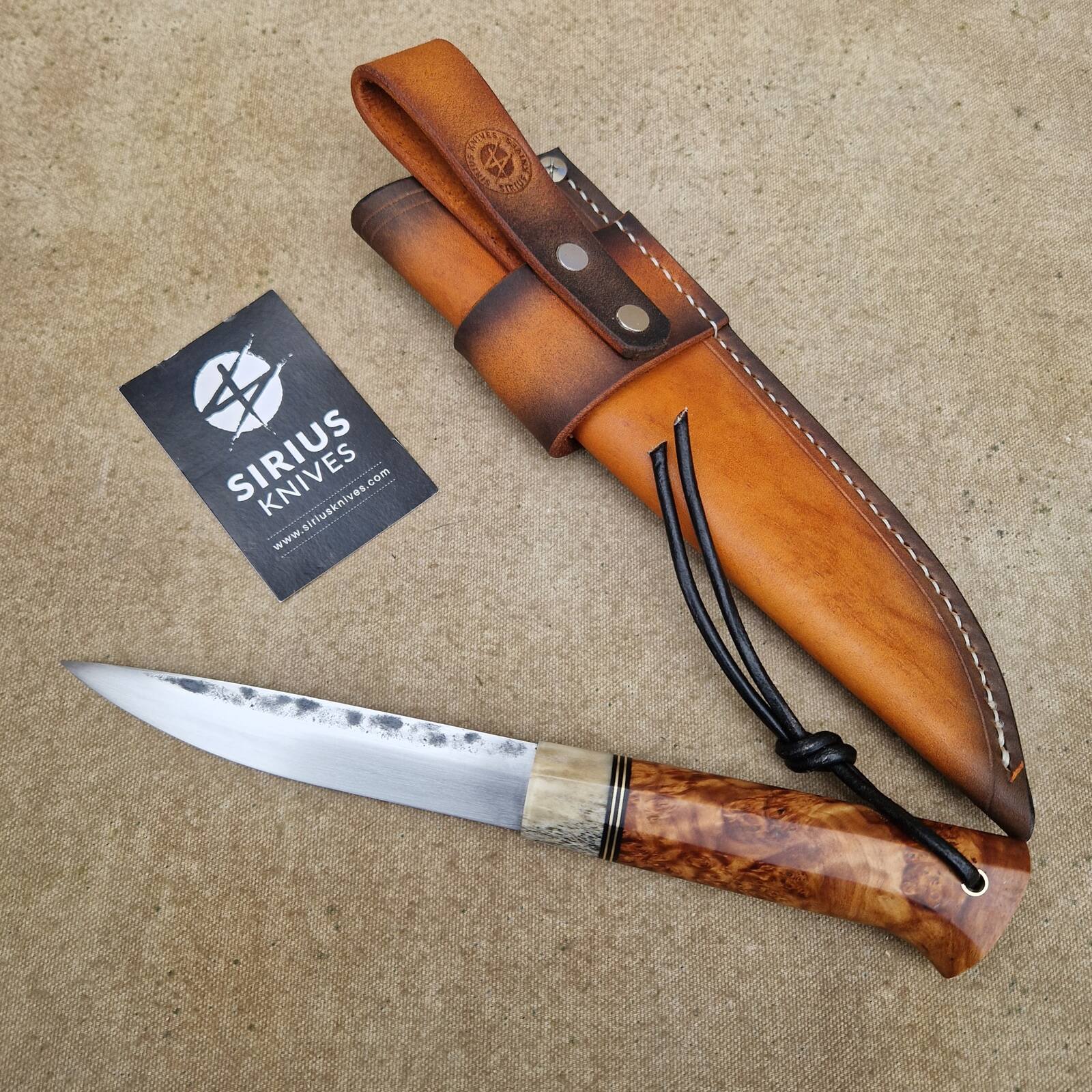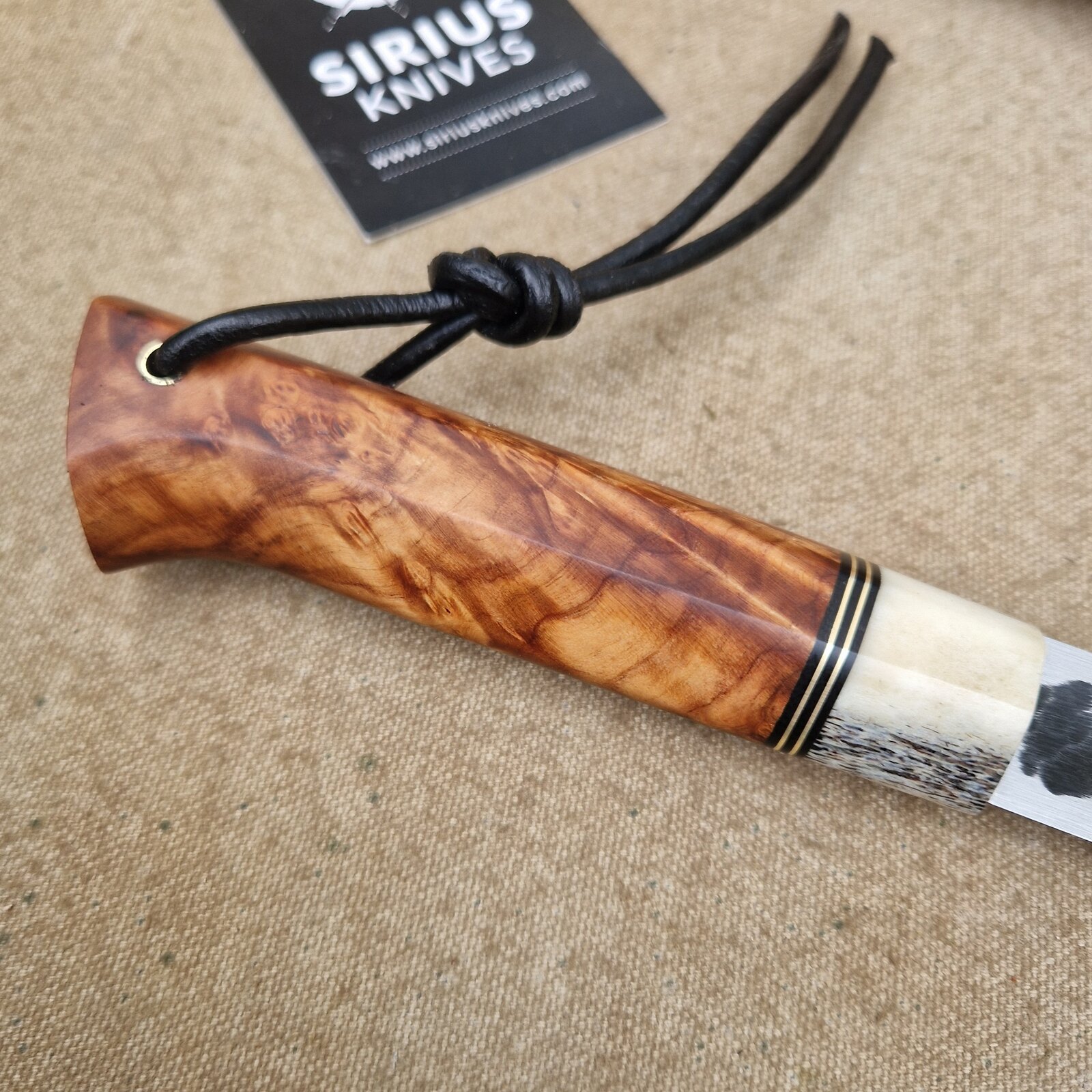 HANDLE: 12 cm long, with antler, brass, g10 and stabilised birch burl